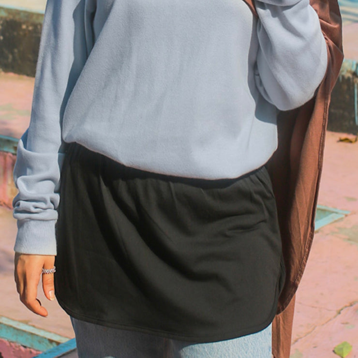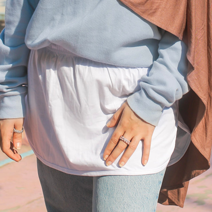 Introducing our pack of 2 shirt elastic extenders! Made from soft cotton jersey, these stylish layered extenders are a must-have. The adjustable design features a short front and long back, perfect for women of all sizes and shapes. Extend the length of your tops, create chic layered looks, and cover trouble spots effortlessly. #ShirtExtender #FashionEssential #LayeredLook #TroubleSpotsCovered #hijab #hijabi #longshirt